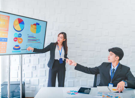 businessmen and secretary presentation report, two colleague excultive conference presentating chart report of new plan marketing to development consultating business in company.