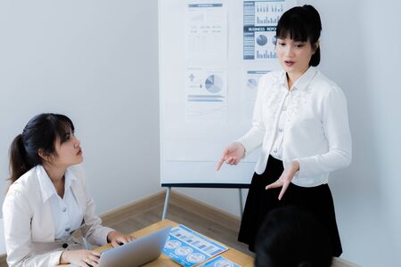 Young businesswoman or manager meeting with employee in conference room together about financial and investment for planning and strategy with chart and graph at the office, business concept.