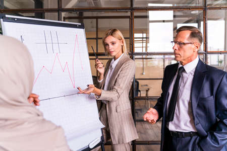 Three colleagues are concentrated on data at the flipchart, disscussing the solutions of their company`s problems and sharing opinions and ideas, in light modern workplace wearing smart clothes