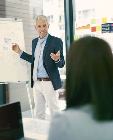 Hes removing all doubt with his stellar presentation. Shot of a young businessman giving a demonstration on a white board to his colleagues in a modern office.