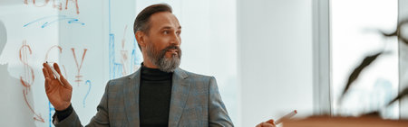 Professional business man standing at meeting room while presenting financial statistic to diverse investors. Smart project manager talking about start up plan while analyzing marketing chart. AIG42.