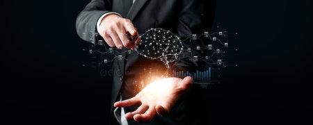 Young businessman holding holding a brain hologram in hand,Brain representing creativity, innovation and similar with futuristic design.