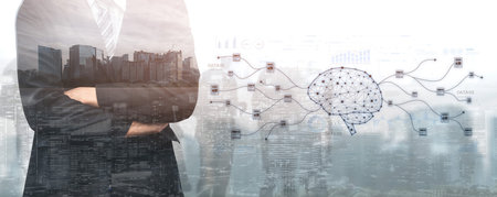 business man wearing blue suit holding laptop on hand with illustration of brain fair on abstract background. the technology of laptop in future will be as intelligent as the human brain, technology concept