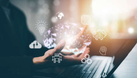 Brain AI with icon business concept,Business using laptop and virtual globe with financial icons future technology, business goals, online communication, graph Screen Icon of media screen, big data