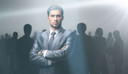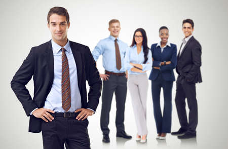 Handsome young businessman standing in front of a group of business people.