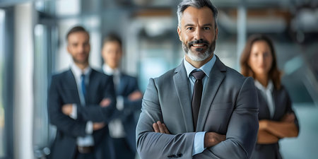 Handsome business man standing confident in the office in front of his team