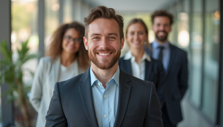 Smiling business team in formal attire, standing in a modern office corridor