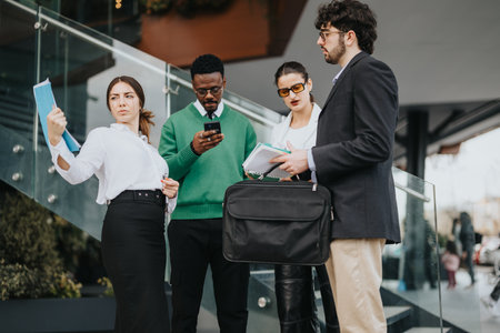 Busy colleagues in smart coats discuss documents outside a modern office building