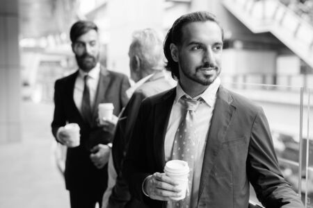 Multi ethnic bearded businessmen together around the city