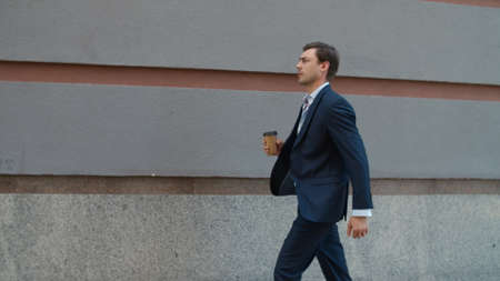 Serious business man going to work with take away coffee outdoor. Confident man walking with coffee at street. Thoughtful employee going to business meeting with coffee at street.