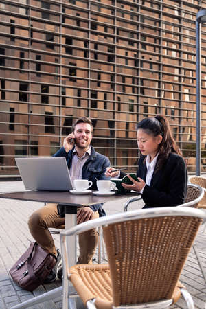 asian woman and caucasian man having work meeting