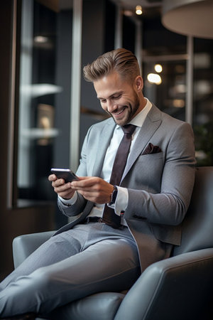 A handsome businessman sitting with mobile phone and smiling. Success person concept.