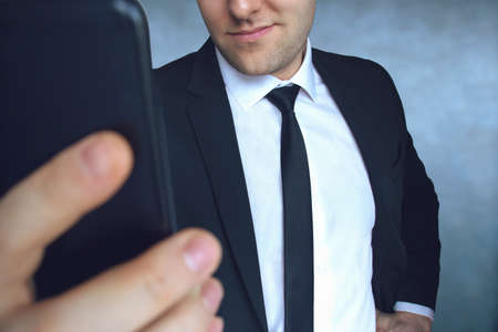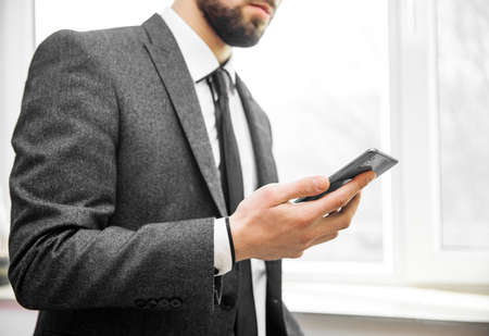 modern successful businessman is sending message in work chat by smartphone