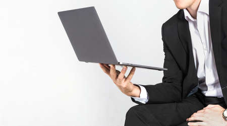 handsome man businessman hold laptop isolated on white, business