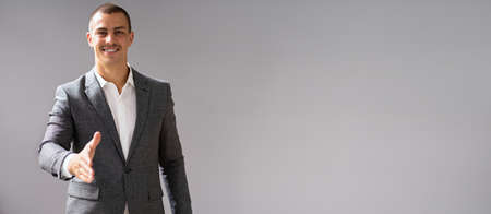 Smiling young businessman shaking your hand wearing a grey suit and black tie