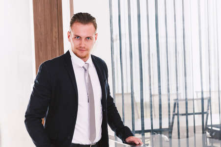 Handsome elegant sales representative in suit waiting for director of company. Man standing in office