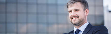 Smiling adult businessman standing in front office building