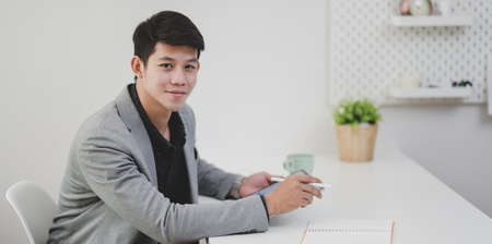 A businessman and office worker man is sitting at a desk in his office. A happy and successful look.