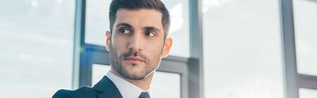 panoramic shot of handsome professional businessman standing in office with sunlight