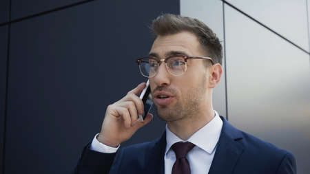 businessman in glasses and suit talking on mobile phone near building