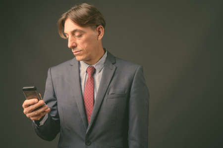 Mature handsome Italian businessman against gray background