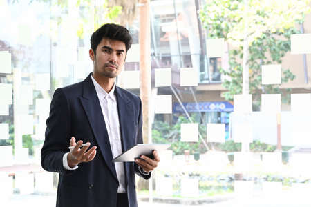 Confident professional businessman in black suit holding digital tablet and standing in bright modern office.