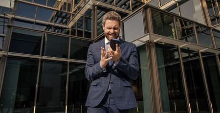 stressed bearded businessman in formal suit with smartphone, panic