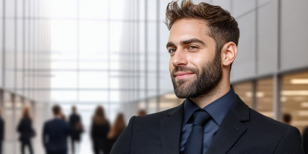 Confident male entrepreneur with a great smile in a suit, thriving in a professional office setting
