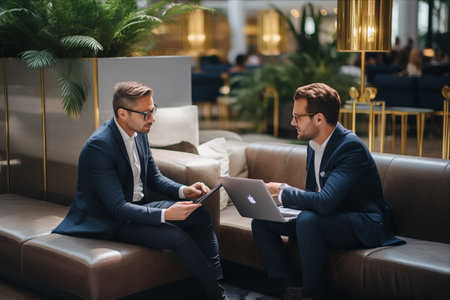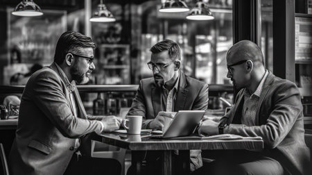 Business rendezvous. Suited gentlemen engaged in discussions at a table in a sophisticated bar, exuding professionalism and strategic conversations.