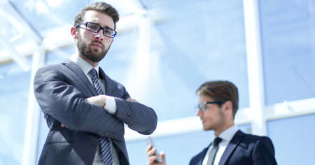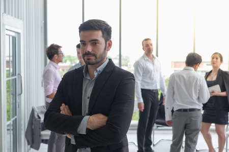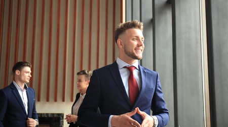 Smiling handsome businessman standing in office and looking at camera on colleagues background