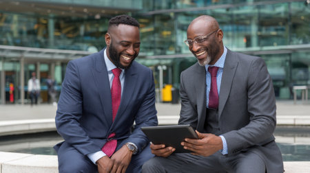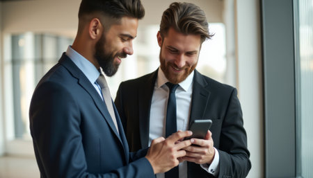 Two well-dressed men, one with a beard and the other clean-shaven, share a light-hearted moment as they engage with a smartphone. Their expressions radiate happiness and camaraderie, set against a modern office backdrop that enhances the atmosphere of professionalism and connection.