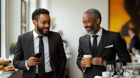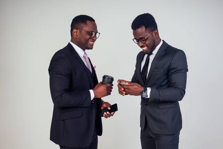 Two african american businessmen drinking coffee and using mobile phone in cafe
