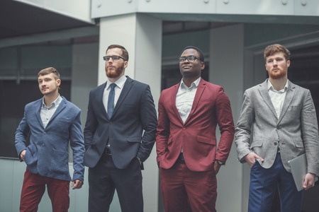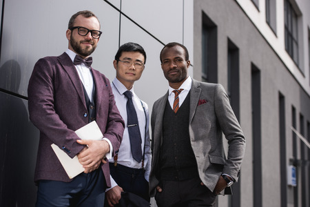 young stylish multiethnic businessmen in formalwear posing outdoors
