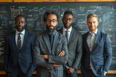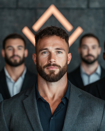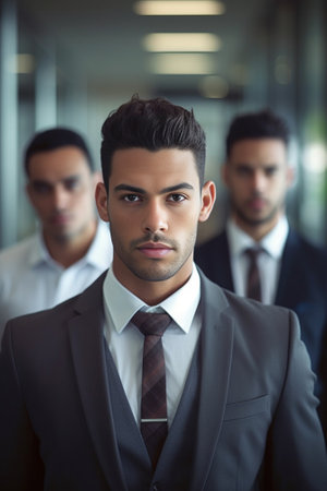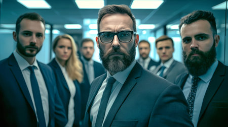 Business colleagues stand together in a sleek office, dressed in suits, emphasizing unity, professionalism, and determination in the corporate landscape.