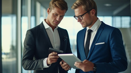Three business professionals in suits collaborate closely, examining information on a tablet in a contemporary office environment during work hours.