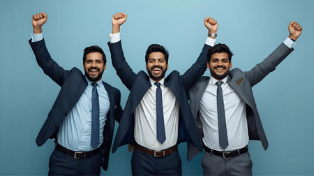 Group of happy indian business people with arms raised celebrating success, isolated over blue background Generative AI