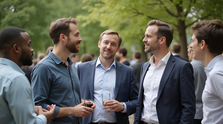 A group of five men is engaged in lively conversation outdoors in a park with trees providing green surroundings They are dressed in various smart-casual outfits Some are holding drinks