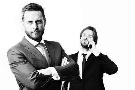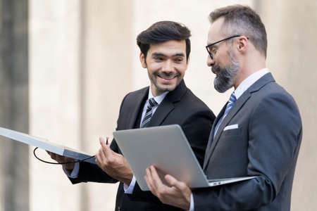 Businessmen in suit with laptop. Online working. Businessmen checking email. Business men freelancing outdoor. Business online. Men working on laptop. Businessmen working online. Freelance concept