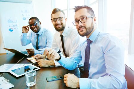 An international team of successful young business men in suits at a meeting are discussing the implementation of business plans together.