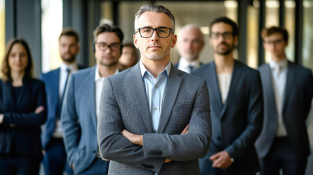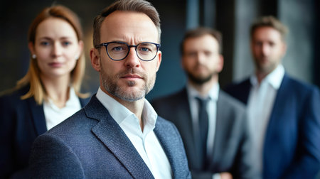 A group of business professionals dressed in suits is standing together in a contemporary office, demonstrating confidence and collaboration towards the camera.