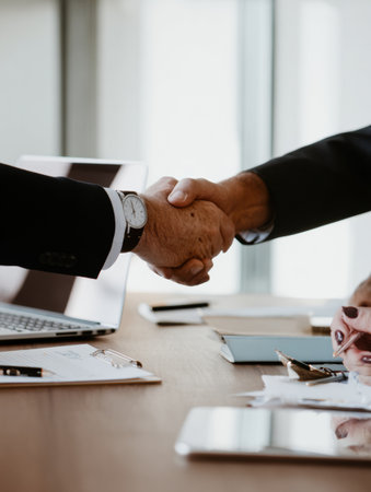 Two business professionals shake hands to sign agreement during a meeting at a contemporary office, with laptops and documents on the table.