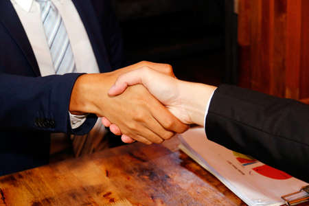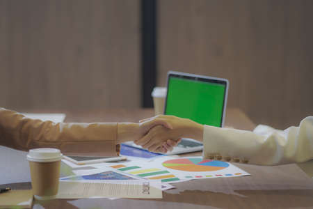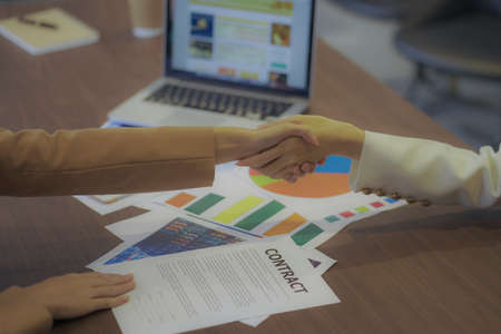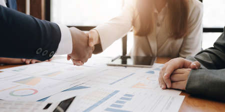 Shaking hand two business leaders talk about charts, financial graphs showing results are analyzing and calculating planning strategies, business success building processes.