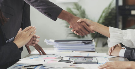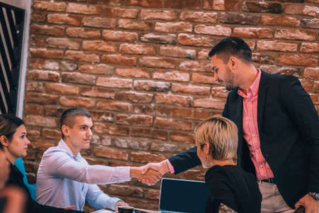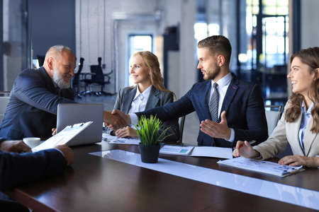 Businessman shaking hands to seal a deal with his partner and colleagues after finishing up meetingin a modern office