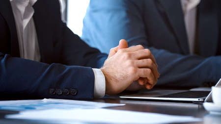 Young businessmen in suits at meeting with team in the office, close-up