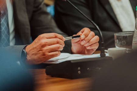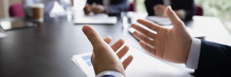 Businessman project leader gesticulate hands while talking during formal group meeting, close up. Convincing speech of speaker. Negotiations concept. Horizontal photo banner for website header design