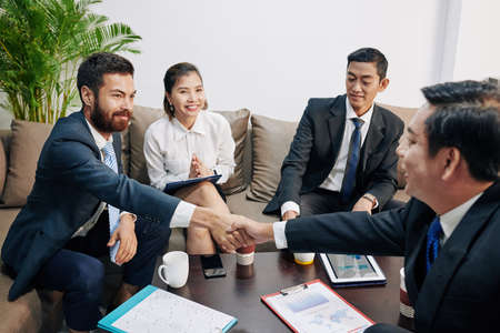 Smiling business people shaking hands after discussing details of collaboration at meeting