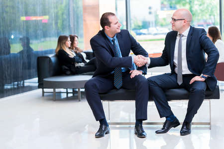 Two businessmen in suits shaking hands to conclude a deal at office standing behind glass wall
