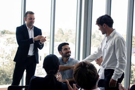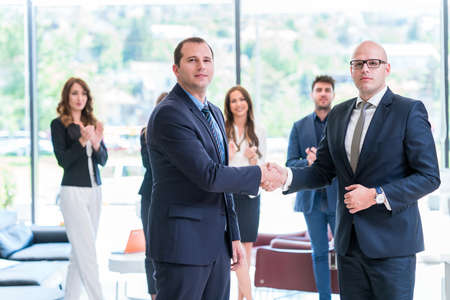 Image two business partners in elegant suit successful handshake together standing in front of group of casual business clapping hands in modern office.Partnership approval and thanks gesture concept