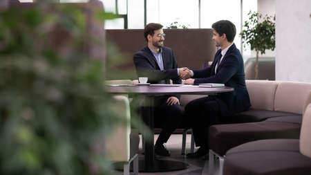 Two smiling business men shaking hands after successful meeting. Leader businessman handshaking of new worker after well done job interview or happy partners making deal with handshake