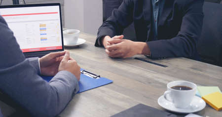 Job interview, businessman listen to candidate answers.